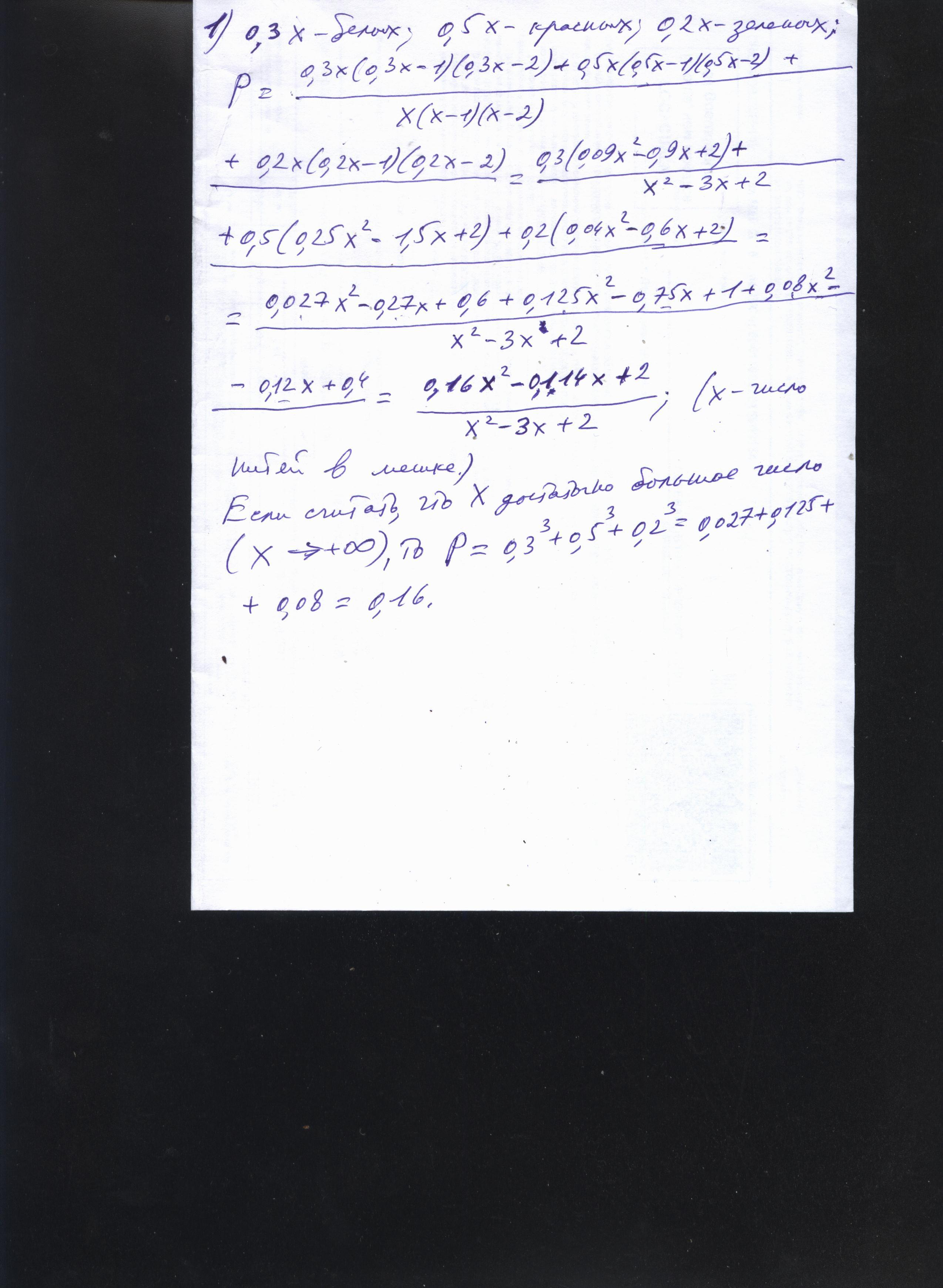 В мешке смешаны нити трех цветов: 30% белых, 50% красных, остальные зеленые. Определить вероятность того, что при последовательном вытягивание наугад трех нитей окажется, что все они одинакового цвета.