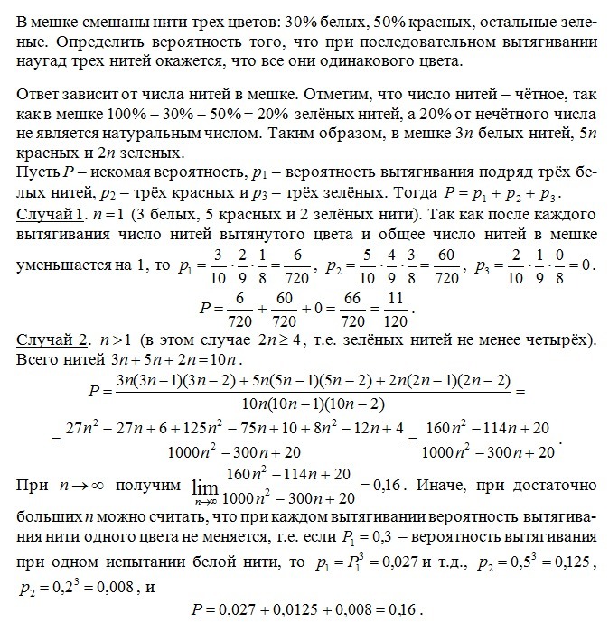 В мешке смешаны нити трех цветов: 30% белых, 50% красных, остальные зеленые. Определить вероятность того, что при последовательном вытягивание наугад трех нитей окажется, что все они одинакового цвета.
