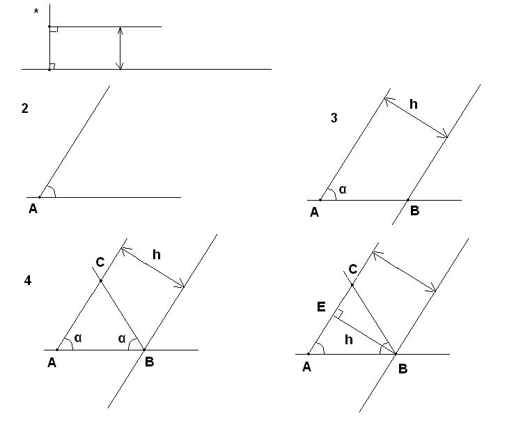 3. Построим прямую д, паралелльную b, на расстоянии, равном высоте h из условий задачи. Обозначим точку В пересечения прямых b и д.