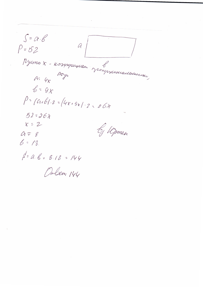 найдите площадь прямоугольника, если его периметр равен 52, а отношения соседних сторон равно 4:9