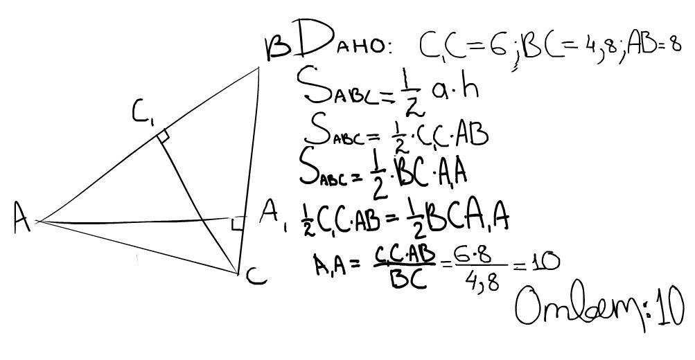 Стороны AB и BC треугольника ABC равны соответственно 8 см и 4,8 см, а высота, проведенная к стороне AB,равна 6 см. Найдите высоту проведенную к стороне BC.