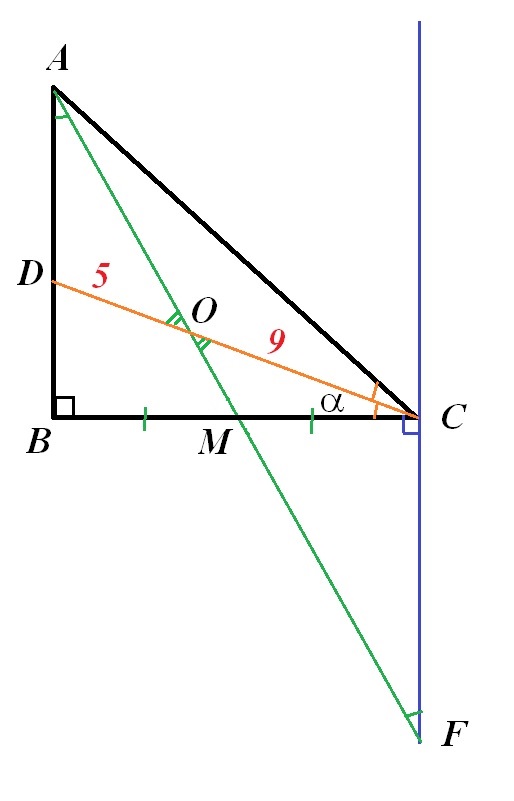 Медиана AM и биссектриса CD прямоугольного треугольника ABC угол B=90 пересекаются в точке O. Найдите площади треугольника ABC, если CO=9, OD=5.