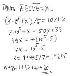 Расшифруйте запись: 7ABCDE:5=ABCDE7. Одинаковые буквы - это одинаковые цифры, разные буквы - разные цифры. Найдите значение суммы: A+B+C+D+E