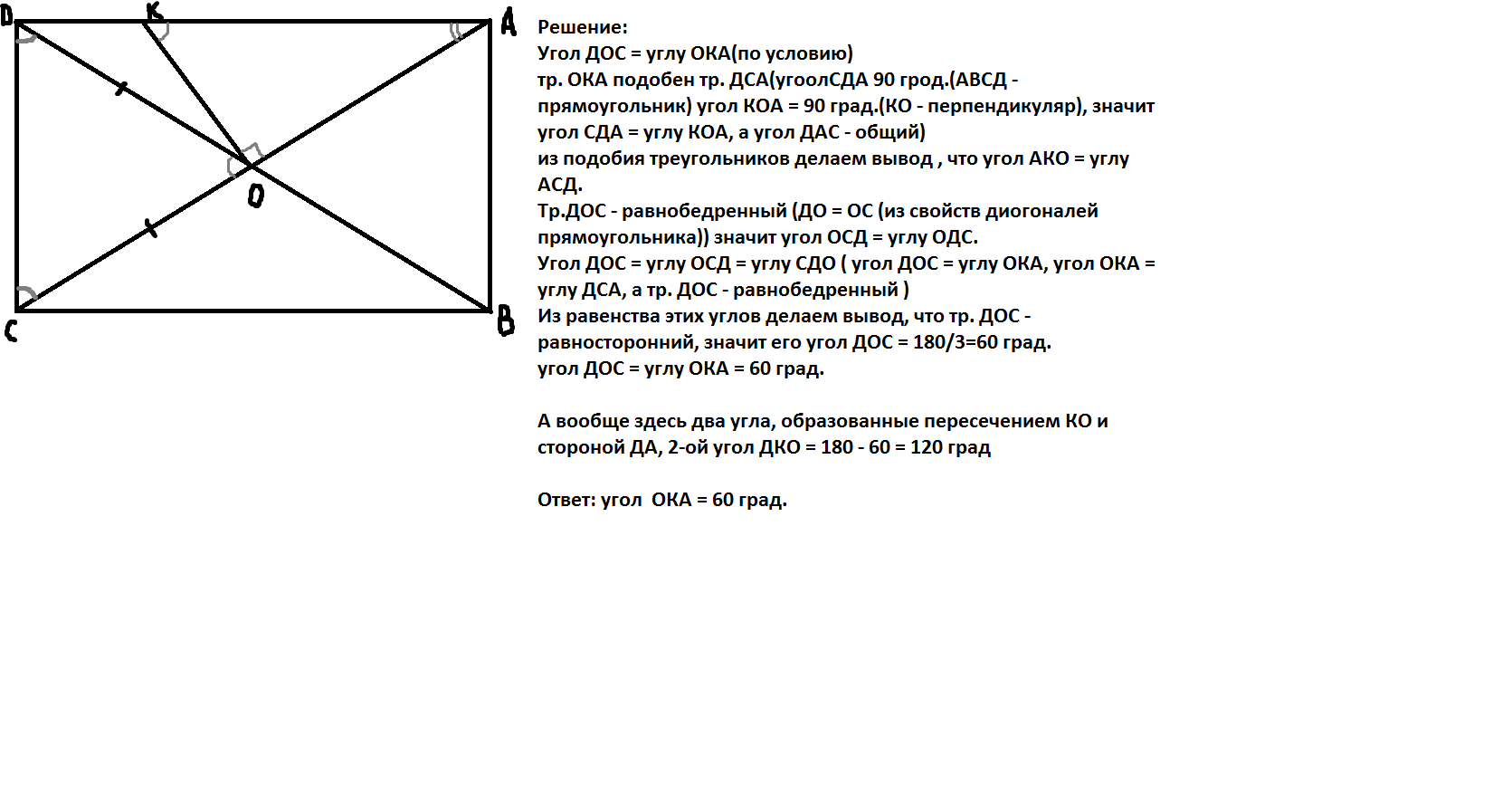 Средний перпендикуляр диагонали прямокутника пересекает его сторону под углом, который ровняется углу между диагоналями. Найти этот углу ( в градусах ). Помогайте :)