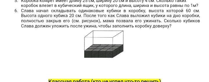 Слава начал складывать одинаковые кубики в коробку, высота которой 60 см. Высота одного кубика 20 см. После того как Слава выложил кубики на дно коробки, полностью закрыв его (см. рисунок), мама позвала его ужинать. Сколько кубиков Слава должен уложить после ужина, чтобы заполнить коробку доверху?