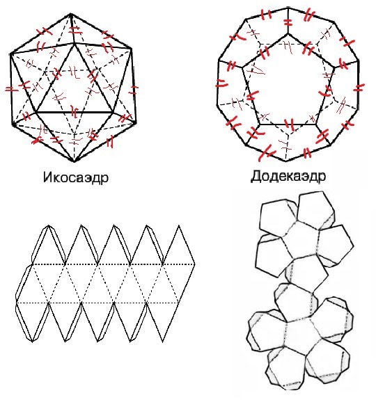 Думаю, принцип понятен: все стороны равны, как в икосаэдре, так и в додекаэдре.