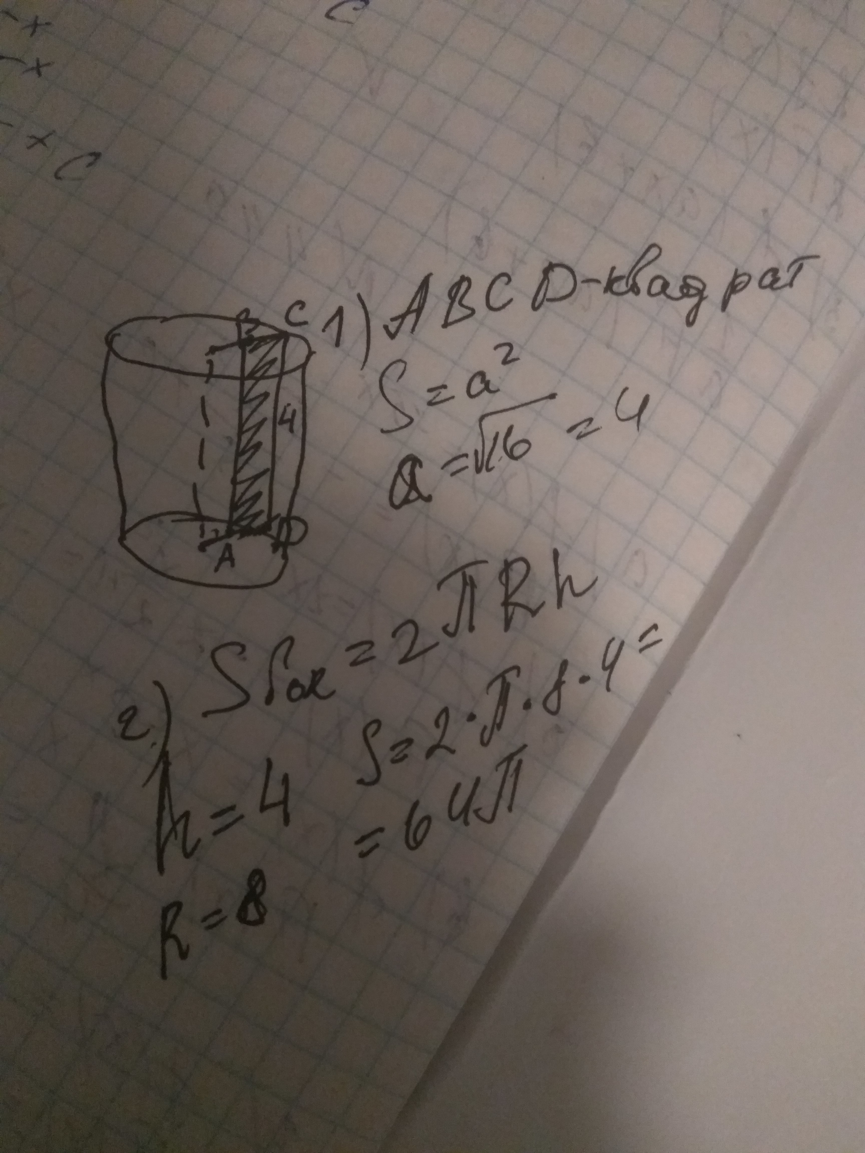 СРОЧНО С РИСУНКОМ!!!!В цилиндре через середину радиуса основания перпендикулярно ему проведено сечение. В сечении получился квадрат площадью 16 см2. Найти боковую поверхность цилиндра.