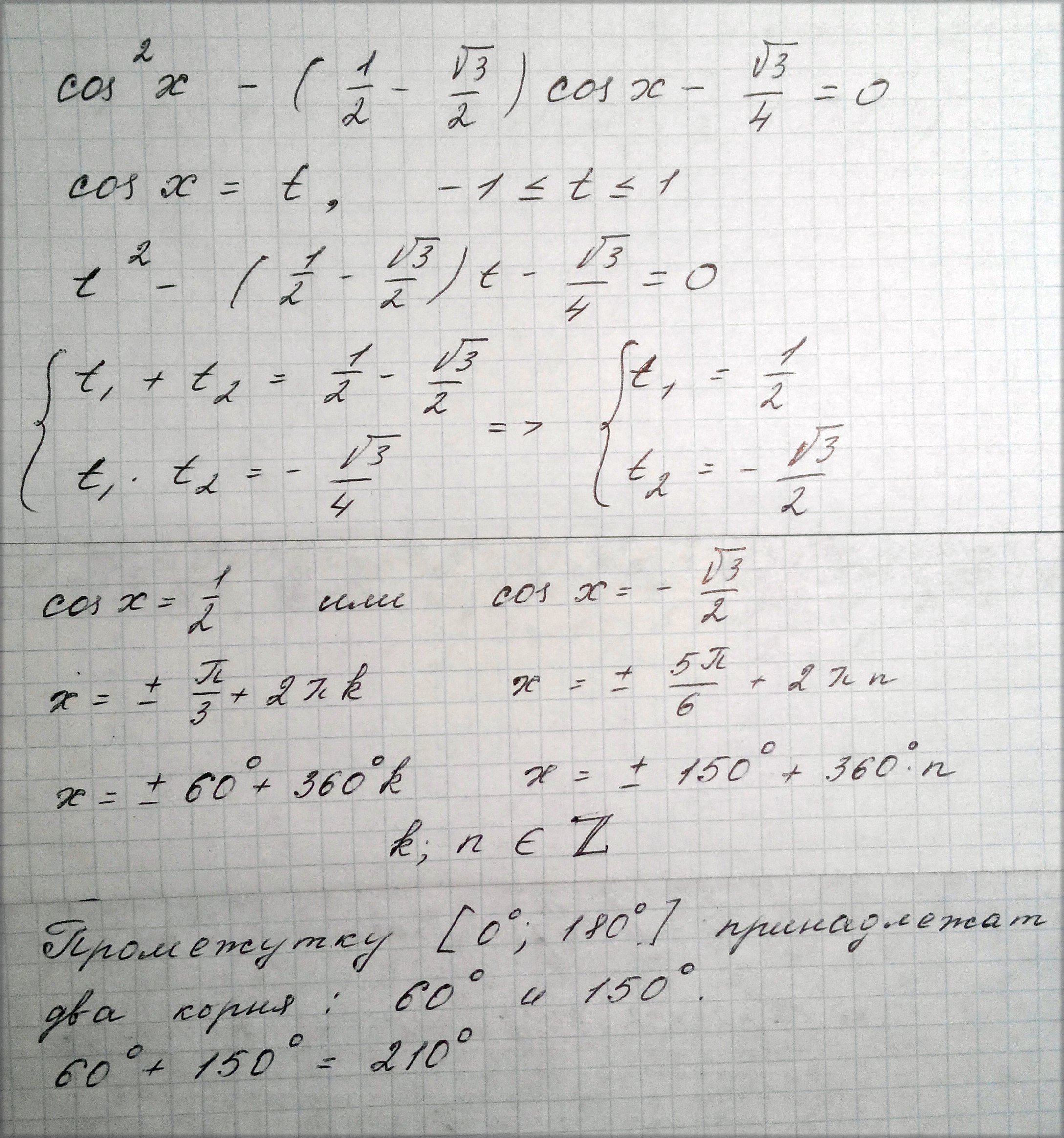 Сумма (в градусах) корней уравнения cos²x-(1/2-√3/2)cosx-√3/4=0,принадлежащих отрезку [0°;180°],равна...