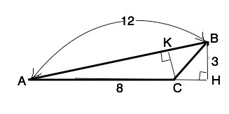 Пусть данный треугольник АВС, АС=8, АВ=12, высота ВН к АС равна 3.