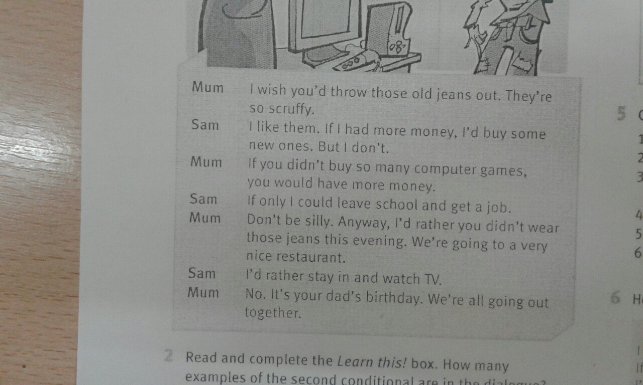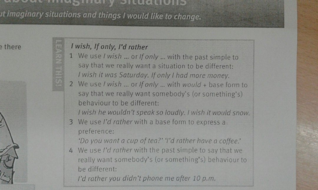 I wish, if only, I'd rather,диалог в фотографии ниже. первое это правило второе диалог.Нужно дописать по три предложения от мамы и от сына.