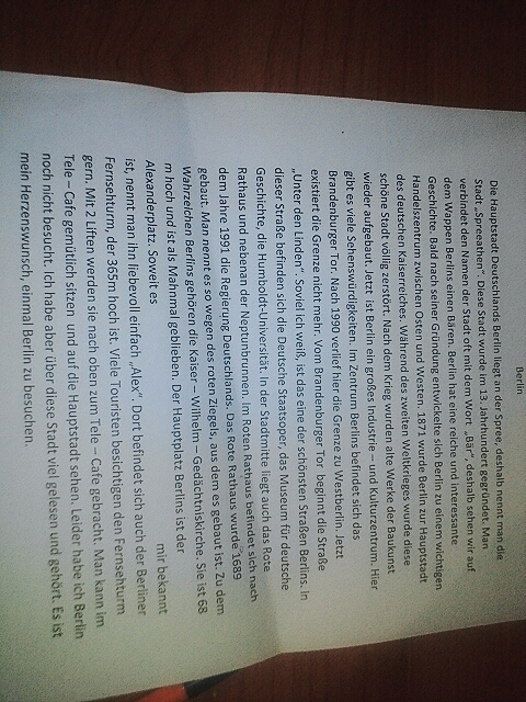 Столица Германии Берлин находиться у реки Шпри, поэтому город называют "Шпри -Афины"(по названию греческого города). Этот город был основан в 13 веке. Название города объединяют со словом "медведь" поэтому мы видим на гербе Берлина медведя.У Берлина богатая и интересная история.Вскоре после своего основания Берлин развился в важный торговыйцентр между Востоком и Западом.в 1871 году Берлин стал столицей немецкой империи. Во время Второй Мировой войны этот красивый город был полностью разрушен. После войны старые работы ( произведения) строительного искусства были снова восстановлены . Сейчас Берлин большой индустриальный и культурный центр. Здесь есть много достопримечательностей. В центре Берлина находиться Бранденбургские Ворота. После 1990 года здесь проходила граница с западным яберлином. Сейчас граница больше не существует. С Бранденбургских Ворот начинается улица" под липами( липа дерево)" . Как я знаю это одна из красивейших улиц Берлина. На этой улице находиться государственная берлинская опера, музей немецкой истории, Гумбольдт университет( по фамилии братьев ученых).В Stadtmitte ( переводиться как середина города, но это район и даже остановка метро которые так и называетються Штадт Митэ) находиться красная ратуша( административное здание,) и рядом фонтан Нептуна. В красной ратуше после 1991 года находиться правительство Германии. Красная ратуша была построена в 1689 году. Ее так называют из-за красных кирпичей из которых она построена. К настоящим символам Берлина относиться короля вильгельма памятный костел( называют кайзер вильгельм гедехнис Киршэ). Его высота 68 метров и он остался как мемориал( памятник).главная площадь Берлина площадь Александра( Александр платц)