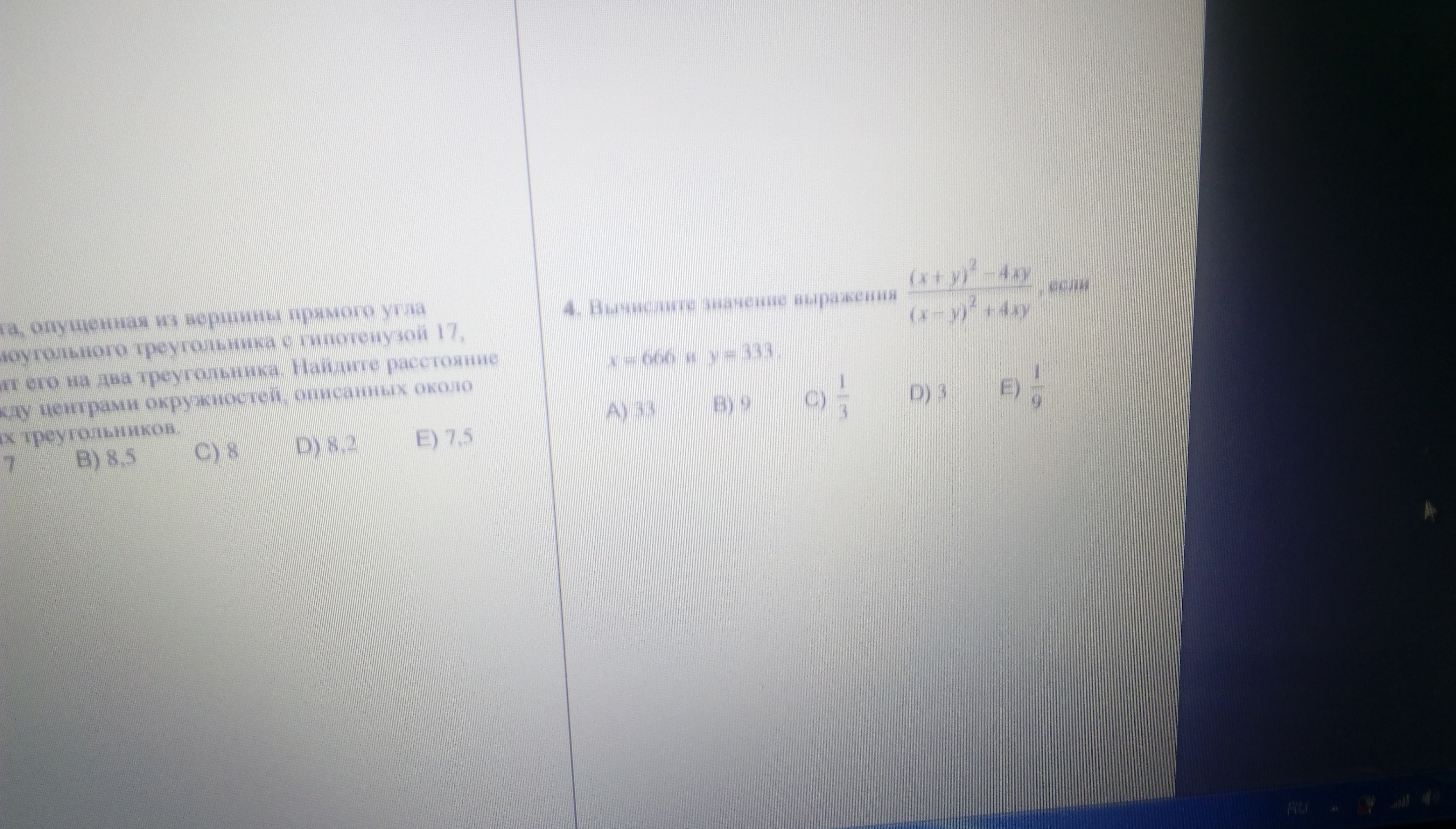 frac{(x+y)^2-4xy}{(x-y)^2+4xy} = frac{x^2+2xy+y^2-4xy}{x^2-2xy+y^2+4xy} = frac{x^2-2xy+y^2}{x^2+2xy+y^2} = frac{(x-y)^2}{(x+y)^2} =\\= frac{(666-333)^2}{(666+333)^2} = frac{333^2}{999^2} = frac{333^2}{(3cdot 333)^2} = frac{333^2}{3^2cdot 333^2}= frac{1}{3^2} =frac{1}{9}