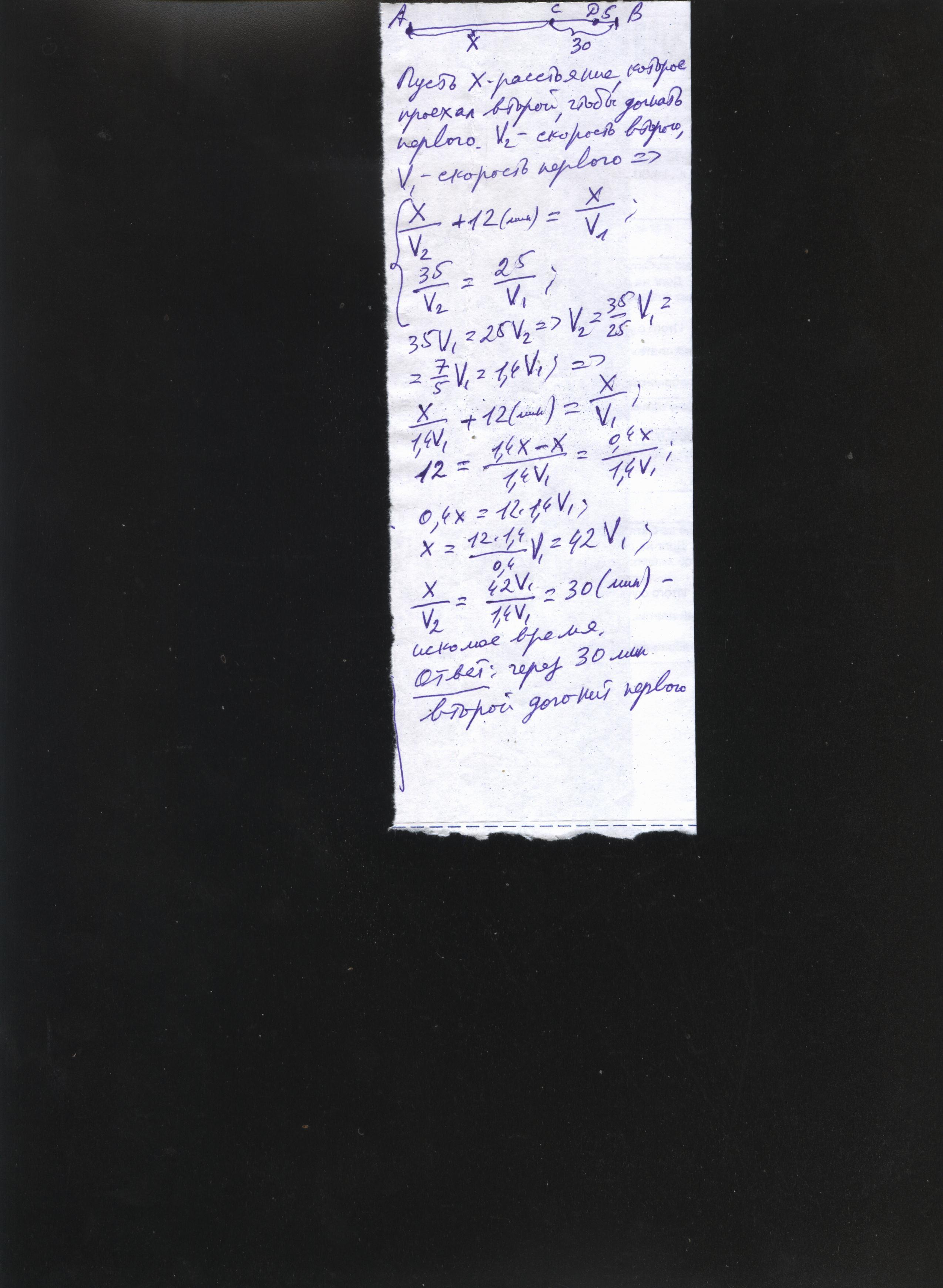Два маршрутных такси с интервалом в 12 мин отправляются от станции к поселку, причем второе такси догоняет первое в 30 км от поселка. Прибыв в поселок, второе такси сразу же поворачивает назад и встречает первое в 5 км от поселка. Через сколько минут после выезда со станции второе такси догнало первое?