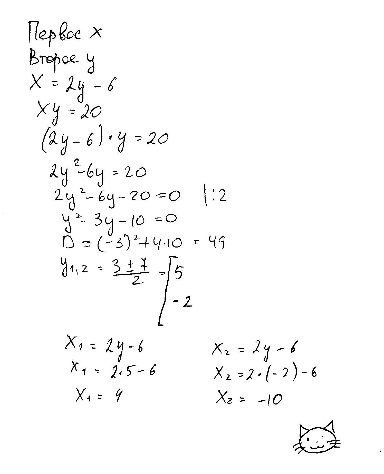 Знайти два натуральних числа,якщо відомо,що перше на 6 менше подвоєнего другого,а їх добуток дорівнює 20.