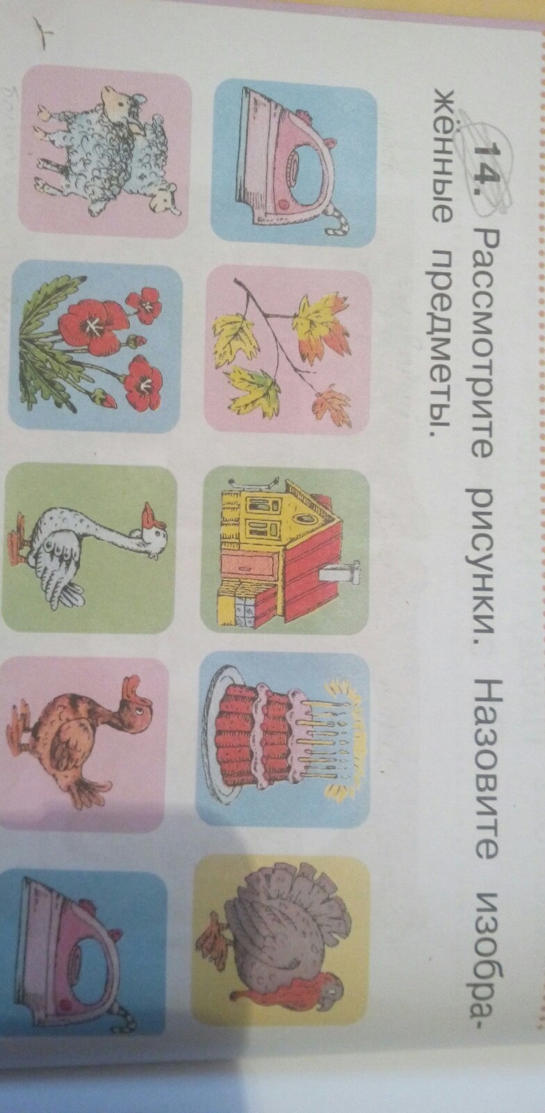 Утюг, листья, дом, торт, индюк, овцы, мак, гусь, утка, утюг.