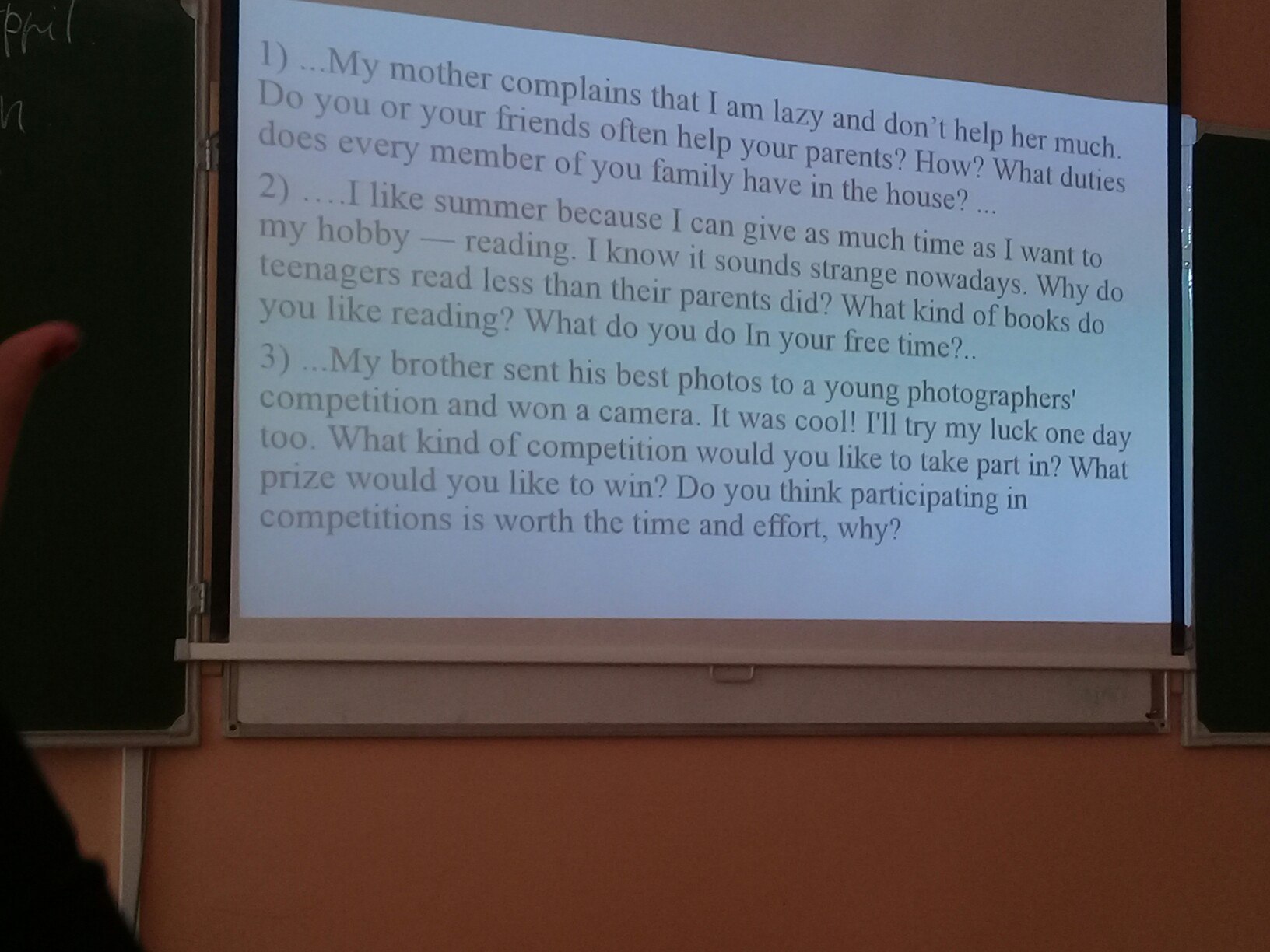Мой брат отправил своё лучшее фото на конкурс юных фотографов и выиграл камеру.Это было круто!Как-то и я испробую свою удачу.В каких конкурсах вы бы хотели участвовать?Какой приз вы бы хотели выиграть?Как ты думаешь, стоит ли участие в конкурсах время и усилий, почему?