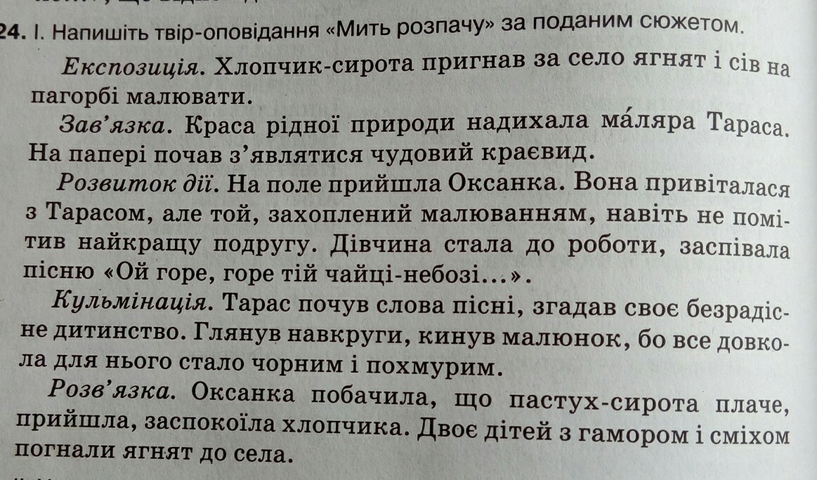 хлопчик сирота пригнав за село ягнят і сів на пагорбі шоб малювати малюнок.краса рідного краю тараса маляра надихнуло намалювати село. на папері з'явилося чудовий краєвид села.На поле прийшла красуння оксанка.Вона привіталася з маляром , але той, захопився малюванням.дівчина стала до роботи і заспівала "ой горе,горе тій чайці-небозі...".