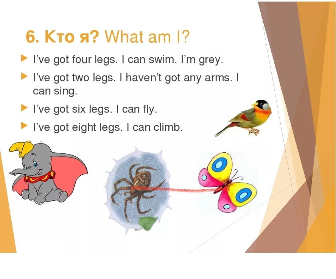 помогите пожалуйста по английскому языку задание с переводом и ответом:What am i?Read and write. 1.i,ve got four legs.I can swim.I,m grey. What am i?........ 2.I,ve got two ltgs.I haven,t got and arms.I can sing. What am i?..... 3.I,ve got six legs.I can fly. What am i?..... 4. I,ve got eight legs.I can climb. What am i?.........
