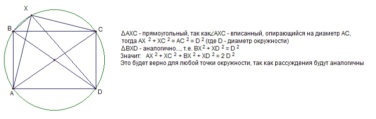 Доказать, что для любой точки Х окружности, описанной около прямоугольника АВСД, сумма XA² + XB² + XC² + XD² - величина постоянная.