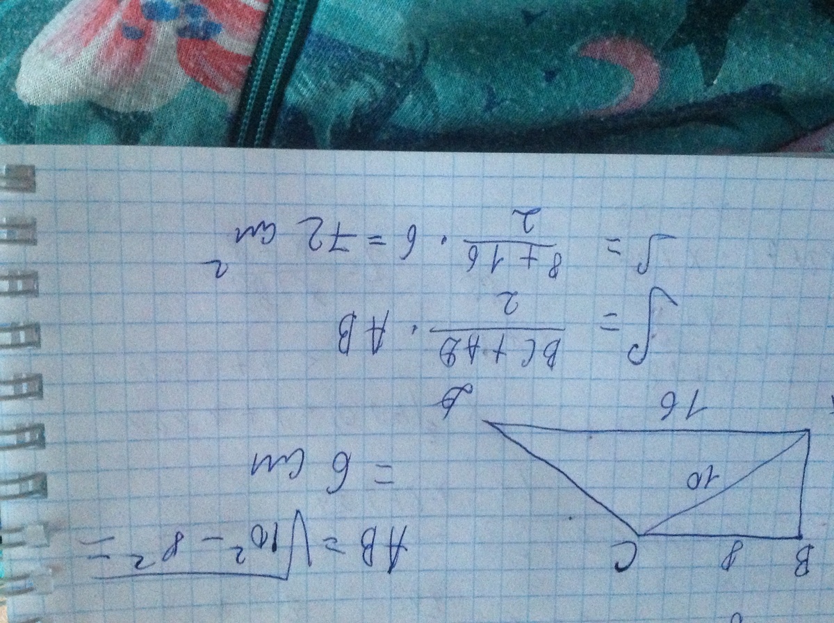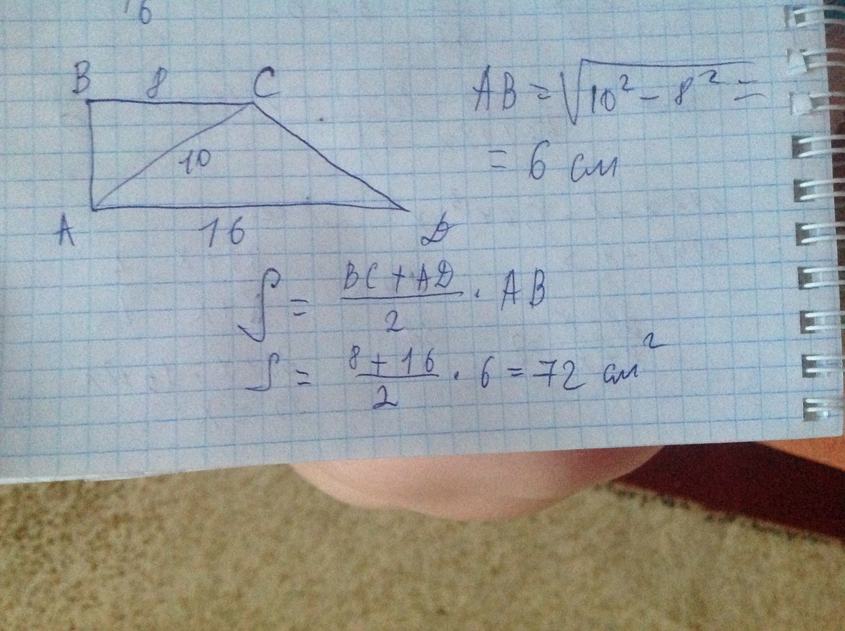 основи прямокутної трапеції дорівнюють 8 см і 16 см, а менша діагональ 10 см. знайти площу трапеції