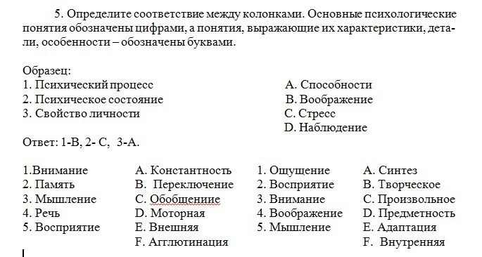 Определите соответствие между колонками. Основные психологические понятия обозначены цифрами, а понятия, выражающие их характеристики, детали, особенности – обозначены буквами.