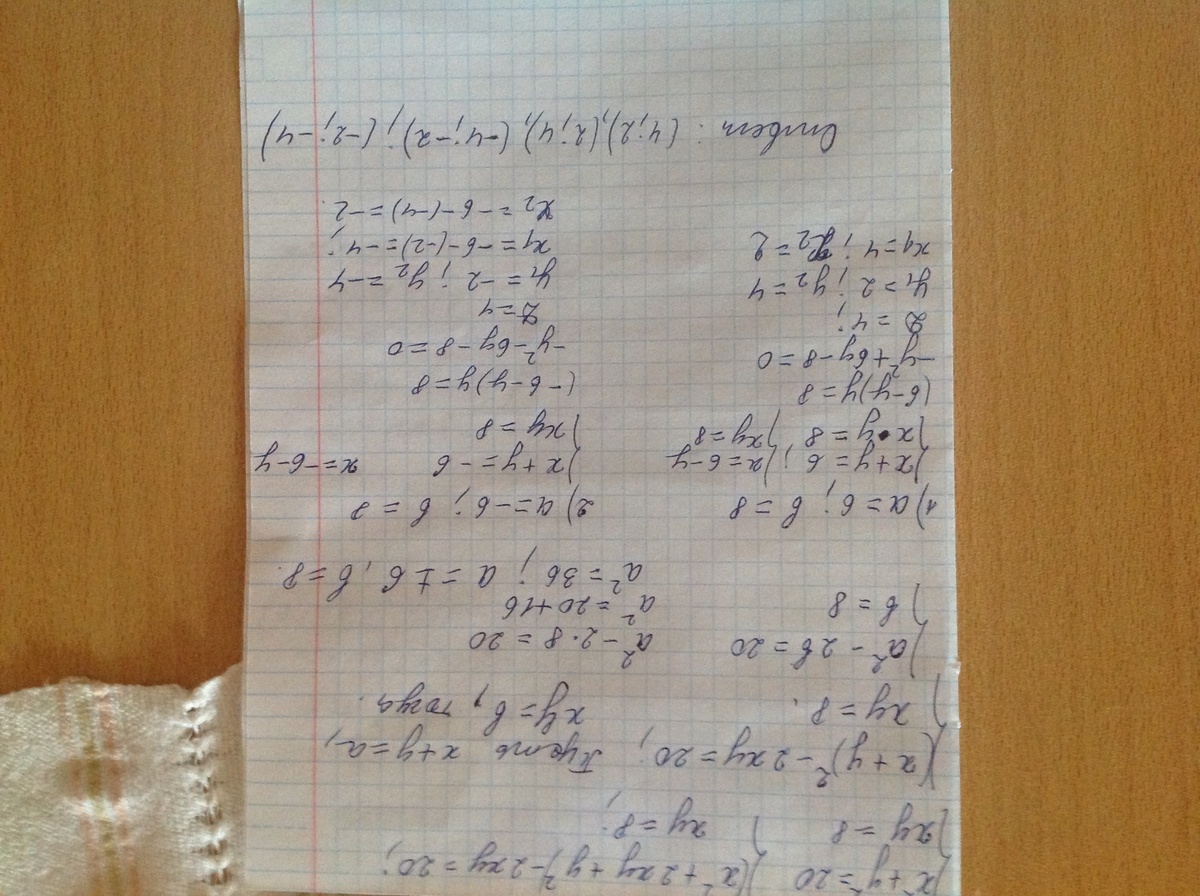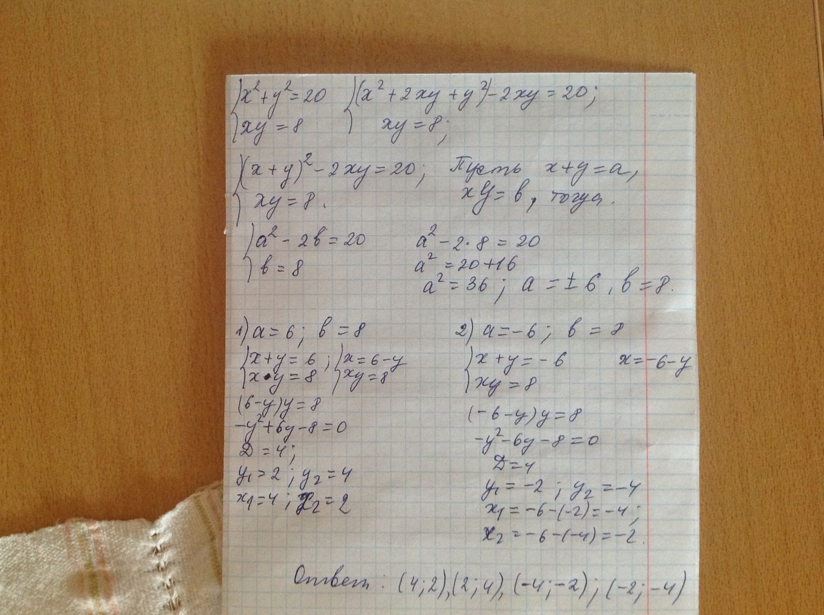 {x^2 + y^2 = 20 Умножим 2-е ур-е на 2 и сложим с1-м ур-ем.