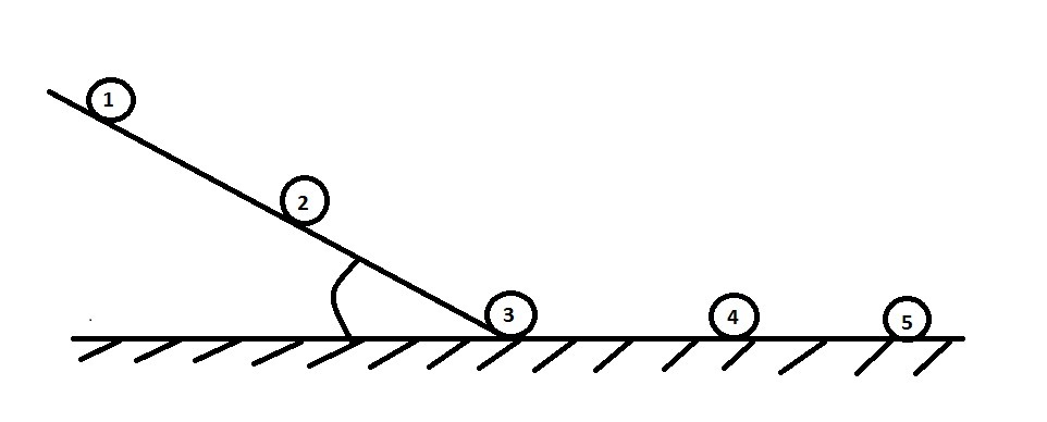 мяч скатывается с наклонной плоскости и до полной остановки по горизонтали поверхности проходит некоторый путь. Наибольшую потенциальную энергию мяч имеет в положении(сила трения на всем пути постоянна):