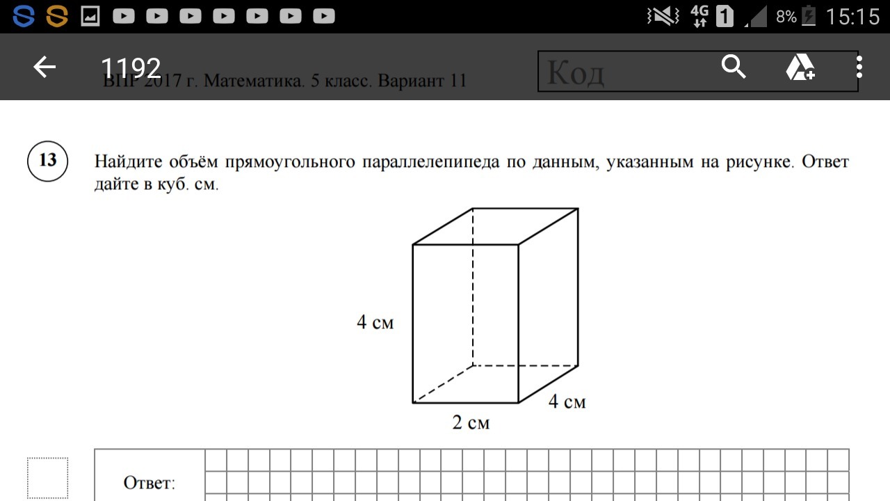 Найдите объем прямоугольного параллелепипеда, по данным указанным на рисунке. Ответ дайте в кубических сантиметрах
