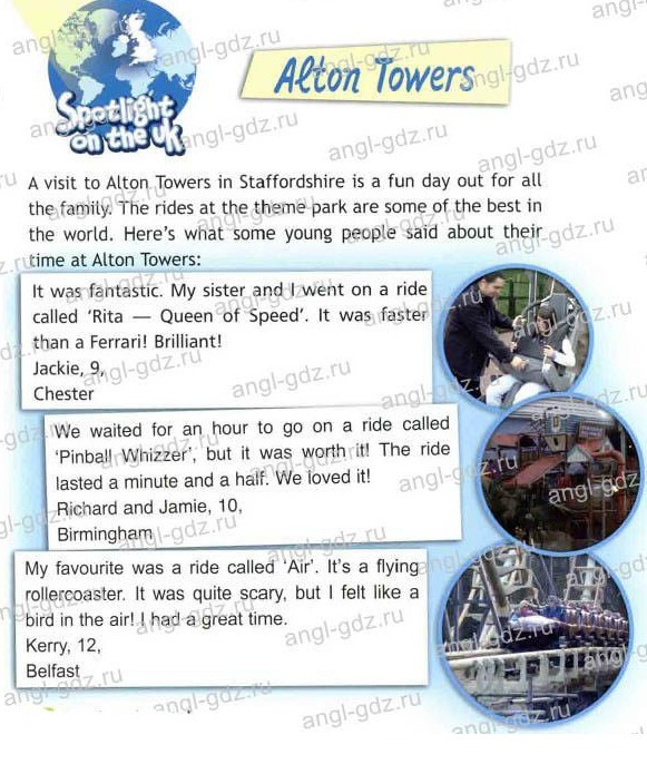 Посещение Alton Towers в Стаффордшире - это веселый день для всей семьи. Поездки в тематический парк одни из лучших в мире. Вот что некоторые молодые люди говорили об их времени Алтон Товерс: Это было фантастически. Мы с сестрой продолжили кататься под названием «Королева скорости Рита». Это было быстрее, чем Ферари! Блестяще! Шикарно! Джек,9, Честер Мы ждали целый час, чтобы отправиться на прогулку под названием «PinballrWhizzer», но это стоило того. Поездка продолжалась полторы минуты. Нам понравилось! Рисард и Джамая,10, Бирмингем.Поездка под названием полет в воздухе над облаками"Это было довольно страшно, но я чувствовал себя птицей в воздухе! Отлично провел время Керри,12
