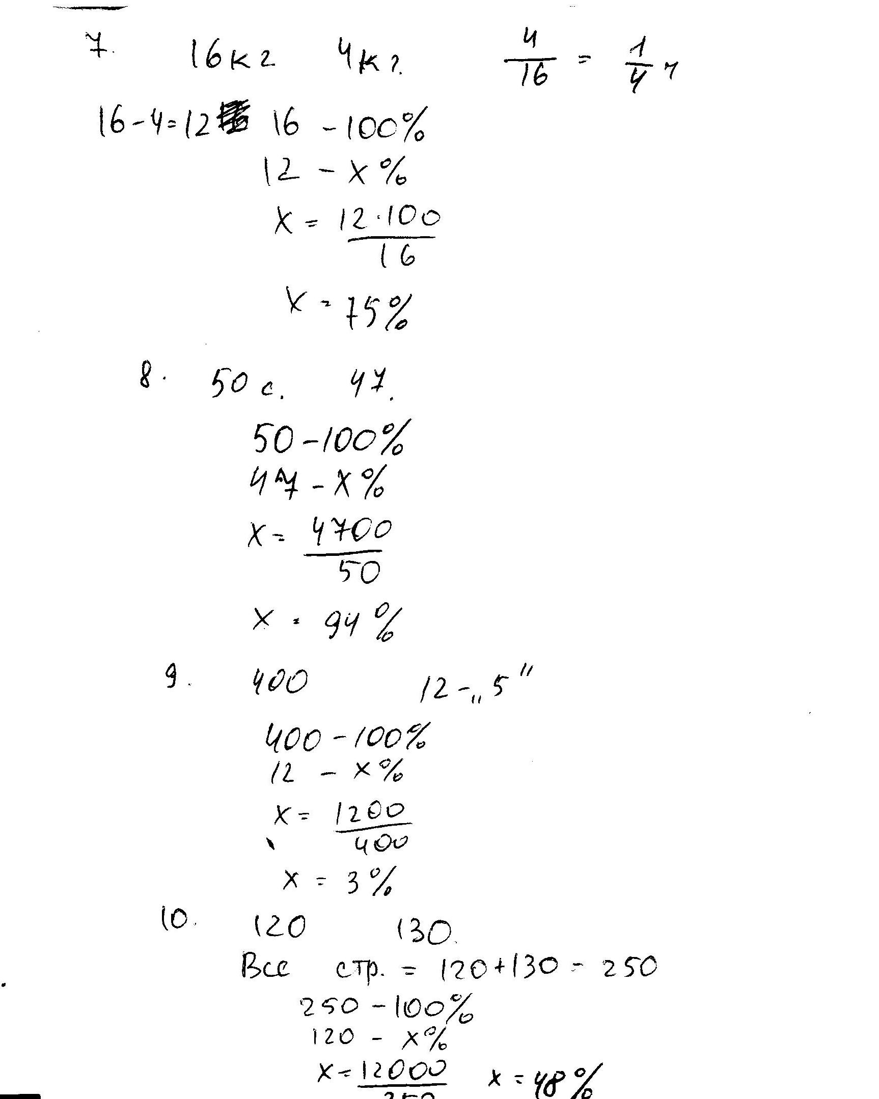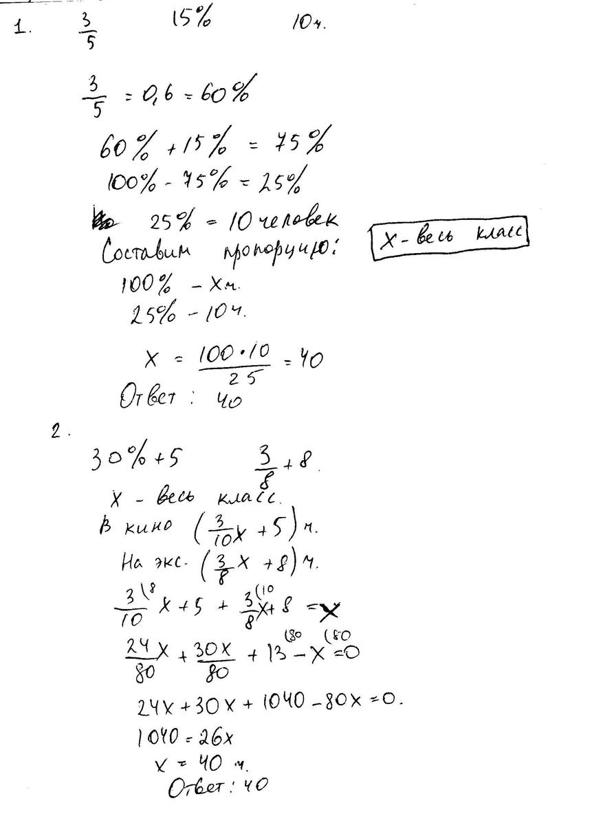 1.3/5 класса пошли в кино, 15% класса - на выставку, А остальные 10 человек готовились к школьному вечеру.Сколько человек в классе?Ответ: 40 человек 2.30% класса и еще 5 человек пошли в кино, а оставшиеся 3/8 и еще 8 человек - на экскурсию. Сколько человек в классе?Ответ: 40 человек 3.Одна треть рабочих предприятия имела отпуск летом, 35 % остальных рабочих отдыхали осенью и еще 2314 человек отдыхали зимой и весной. Сколько рабочих на предприятии?Ответ: 5340 человек 4.Магазин продал до обеда 20% привезенного картофеля, а после обеда 3/16 остатка. После чего осталось продать еще 2,6 тонны картофеля.Сколько картофеля привезли в магазин?5. При продаже товара за 693 руб получено 10% прибыли. Определите себестоимость товара.Ответ: 630 руб 6.Колхоз продал продукции на 45 000 руб и имел 10% прибыли. Определите себестоимость продукции?Ответ: 50 000 руб 7.Из 16 кг свежих груш получили 4 кг сушеных.Какую часть от массы свежих груш составляет масса сушеных? Выразите эту часть в процентах.Сколько процентов массы теряется при сушке?8.Посадили 50 семян, 47 из них взошли. Определите процент всхожести семян.9.В школе 400 учащихся, 12 из них учатся на "5".Сколько процентов учащихся школы учится на "5"?10.Маша прочитала 120 страниц, и ей осталось прочитать 130 страниц книги. Сколько процентов всех страниц она прочитала? Сколько процентов всех страниц ей осталось прочитать?