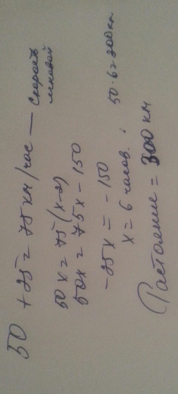 Оба втомобиля проехали одинаковое растояние. Скорость легковой=50+25=75км/час. Возьмем время грузовика за х, тогда время легковой х-2