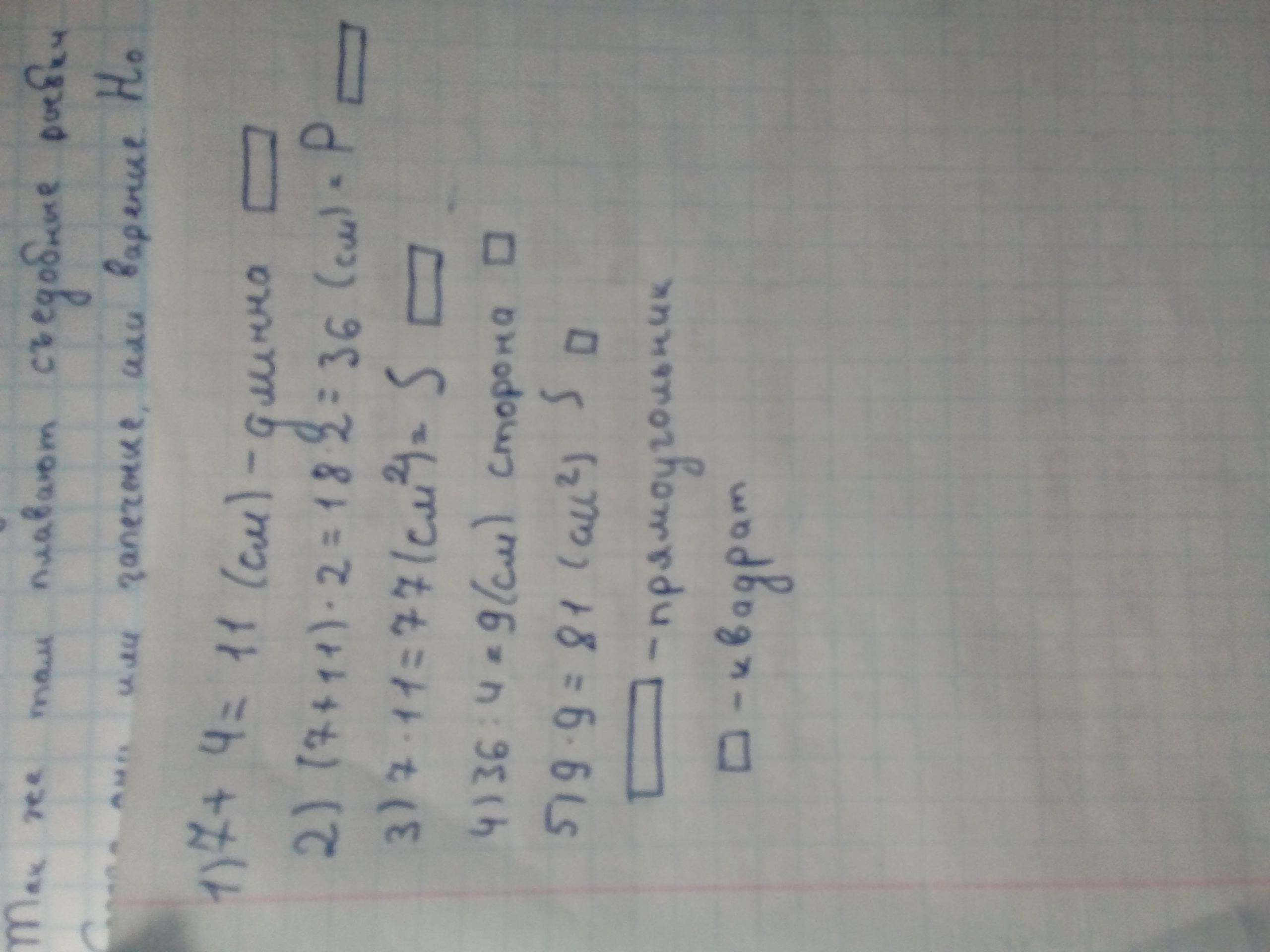 Помогите пожалуйста! Ширина прямоугольника 7 см, а длина на 4 см больше. Найди периметр и площадь прямоугольника. Найди площадь квадрата, имеющего такой же периметр.