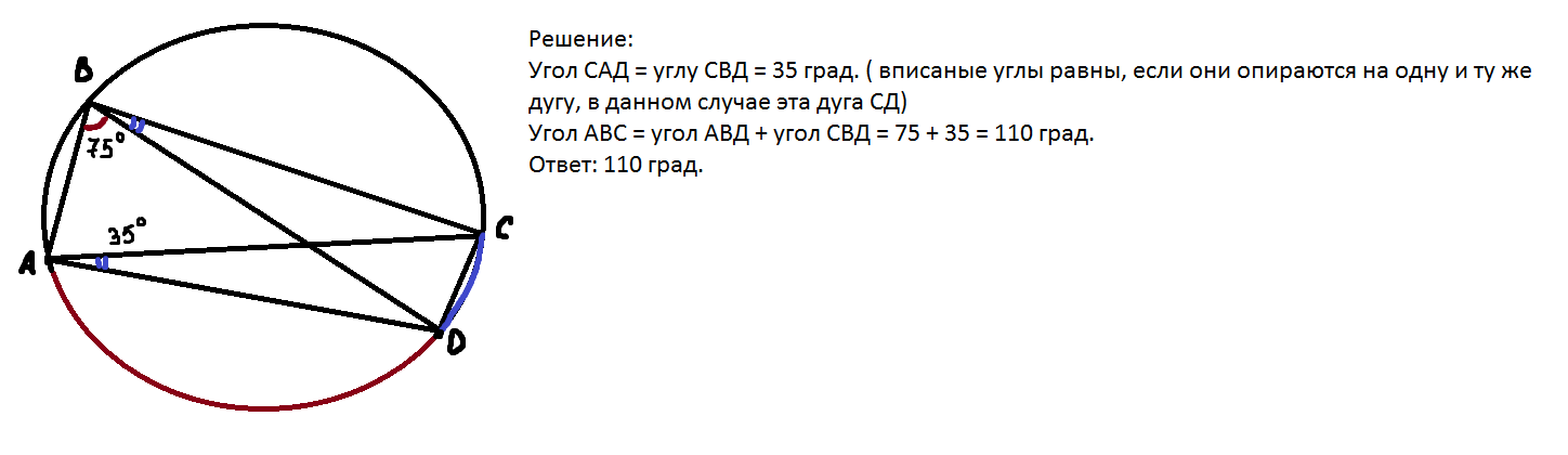 четырёхугольник АВСD вписан в окружность.Угол АВD равен 75 градусов,угол САD 35 градусов.Найдите угол АВС.ответ дайте в градусах