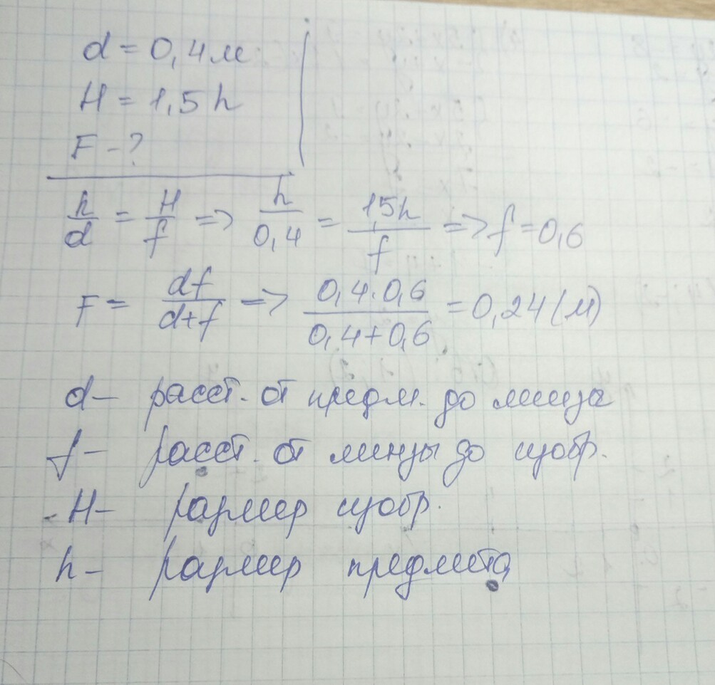 Изображение предмета, находящегося на расстоянии 40 см от собирающей линзы, получилось увеличенным в 1.5 раза. Каково фокусное расстояние линзы?