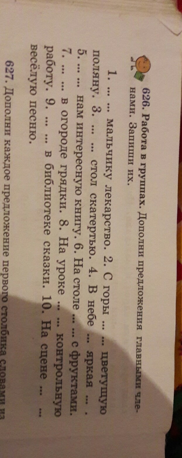 1) Аптекарь продает мальчику лекарство. 2)С горы Юля видела цветущую поляну 3) Мама застелила стол скатертью 4)В небе засияла яркая звезда 5)Дети читали интересную книгу 6)На столе стояла ваза с фруктами 7)Дедушка поливал в огороде грядки 8)На уроке ученики выполняли контрольную работу 9) Школьники взяли в библиотеке сказки 10)На сцене артисты исполняли веселую песню