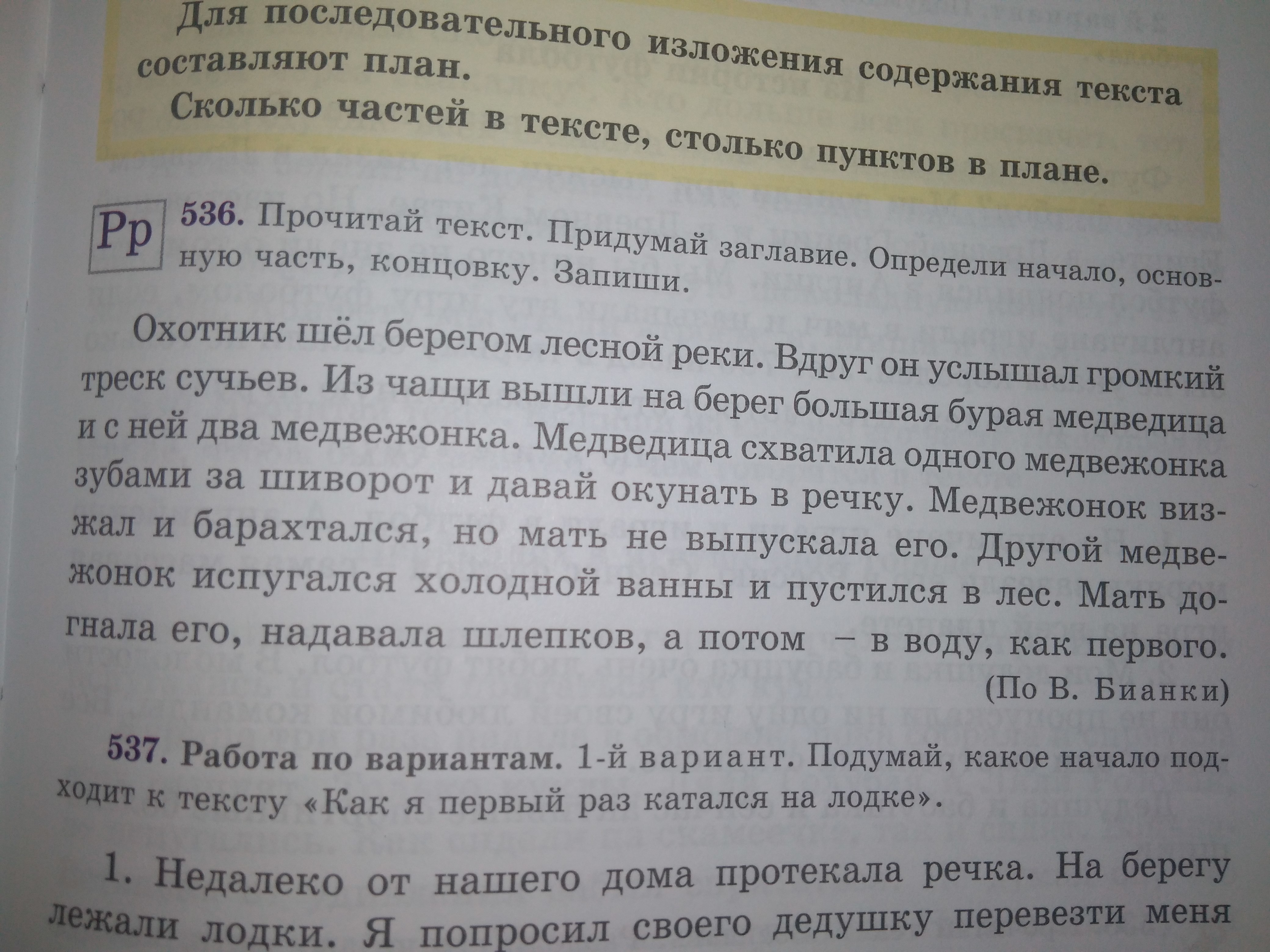 Охотник шёл берегом лесной реки. Вдруг он услышал громкий треск сучьев. Из чащи вышли на берег большая бурая медведица и с ней два медвежонка. (начало)