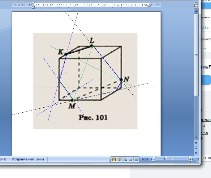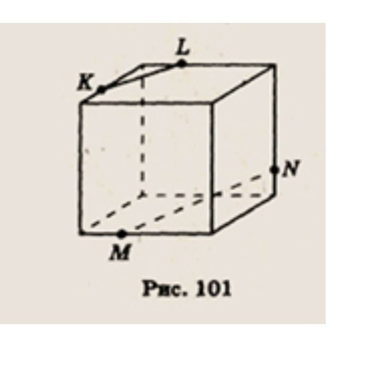 Точки К, L, М и N лежат на ребрах куба (рис. 101). Скопируйте рисунок и определите, существует ли точка пересечения отрезков KN и ML.