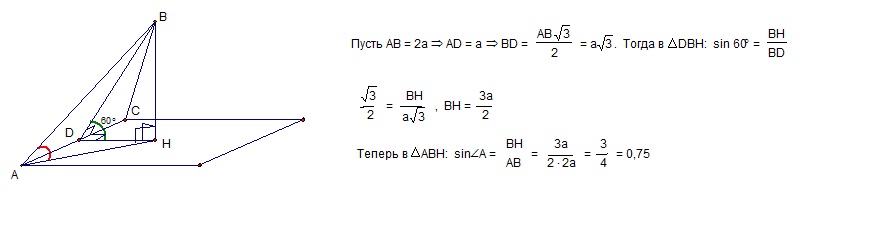 Через сторону АС правильного треугольника ABC проведена плоскость. Медиана BD образует угол 60 градусов с плоскостью. Найдите синус угла между прямой AB и плоскостью.