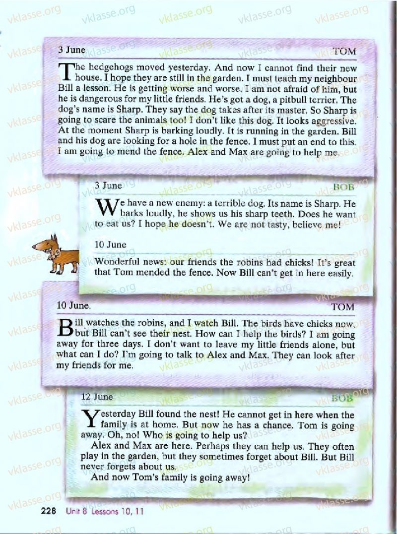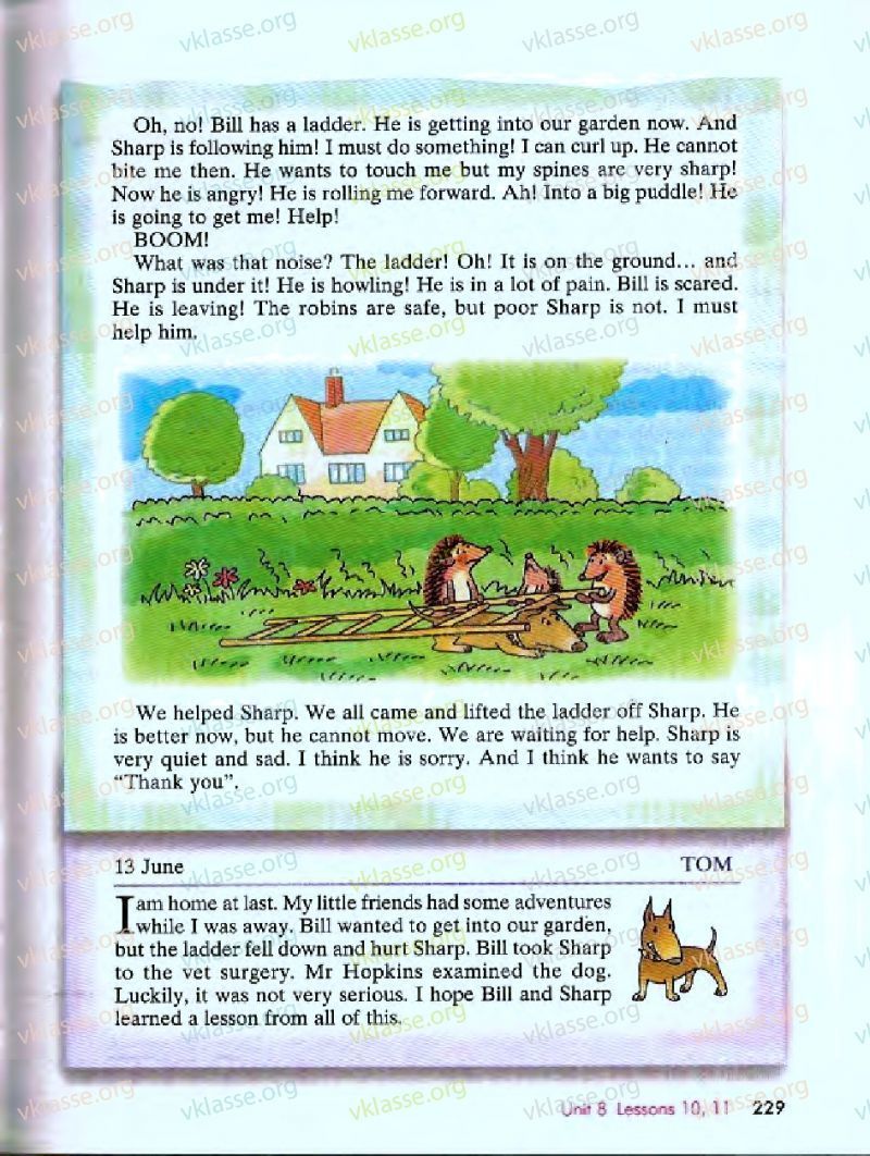 У нас появились новые соседи. Семья переехала на прошлой неделе. У них есть мальчик моего возраста. Его зовут Билл. Но Билл не очень дружелюбен. Думаю, он ставит мусор в нашем саду. Бедные ежи. Они в беде. Каждое утро я собираю мусор в саду. И каждый вечер снова мусор. Я должен сделать что-нибудь с этим.