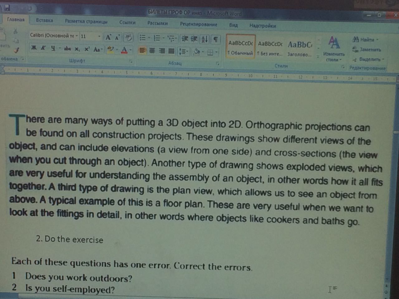 Здесь представлено множество способов помещения 3D-объекта в 20 орфографических просекций, которые можно найти во всех строительных проектах. Эти чертежи показывают различные виды объекта и могут включать в себя возвышения вида с одной стороны) и пересекает вид, когда вы прорезаете Объект). Другой тип drawg показывает разобранные виды, которые очень полезны для понимания сборки объекта, другими словами, как это выглядит следующим образом. Вид чертежа - это вид сверху, который позволяет нам видеть объект сверху. Типичный пример этого - план обеспечения безопасности. Они очень полезны, когда мы хотим подробно рассмотреть заявки. Другими словами, где объекты, такие как плиты и ванны идти. 2. Выполнение упражнения. Каждый из этих вопросов имеет одну ошибку. Исправьте ошибки. 1 Вы работаете на открытом воздухе? 2 Вы работаете на себя?