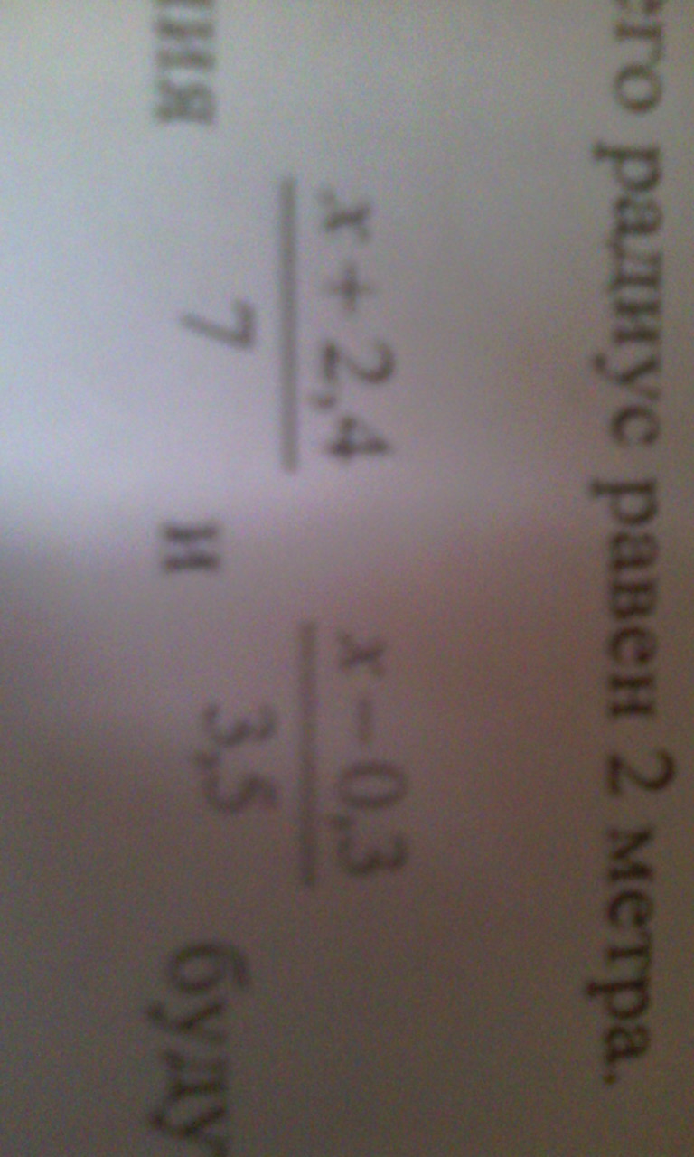 frac{x+2,4}{7}= frac{x-0,3}{3,5} \ 3,5*(x+2.4)=7*(x-0.3)   \ 3.5x+8.4=7x-2.1 \ 3.5x-7x=-2.1-8.4 \ -3.5x=-10.5 \ x=-10.5/(-3.5) \ x=3