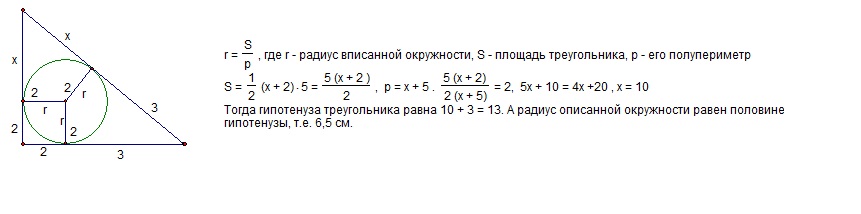 Использовано: формула радиуса вписанной в треугольник окружности через его площадь и полупериметр, свойство центра вписанной окружности и центра окружности, описанной около прямоугольного треугольника