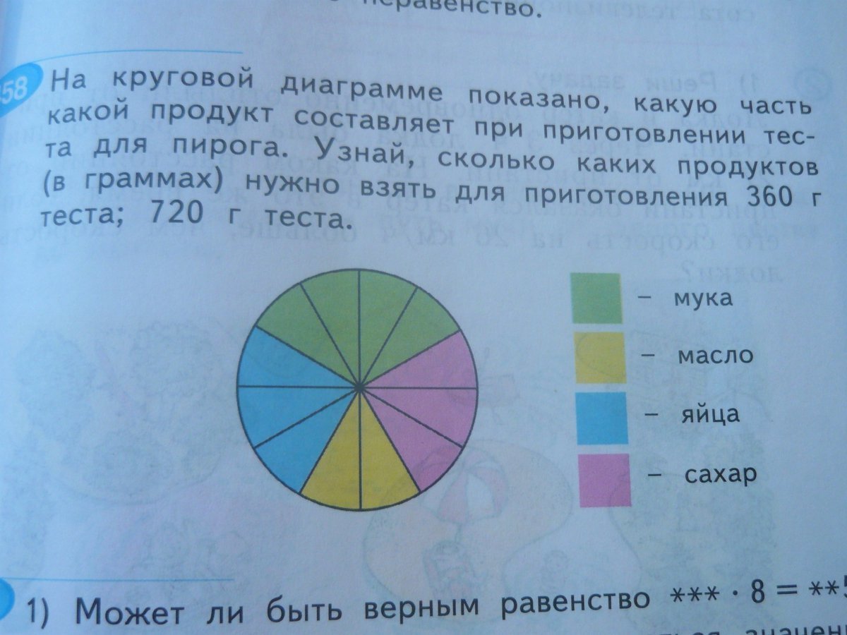 На круговой диаграмме показано, какую часть какой продукт составляет при приготовлении теста для пирога. Узнай, сколько каких продуктов (в граммах) нужно взять для приготовления 360 грамм текста; 720 грамм теста.