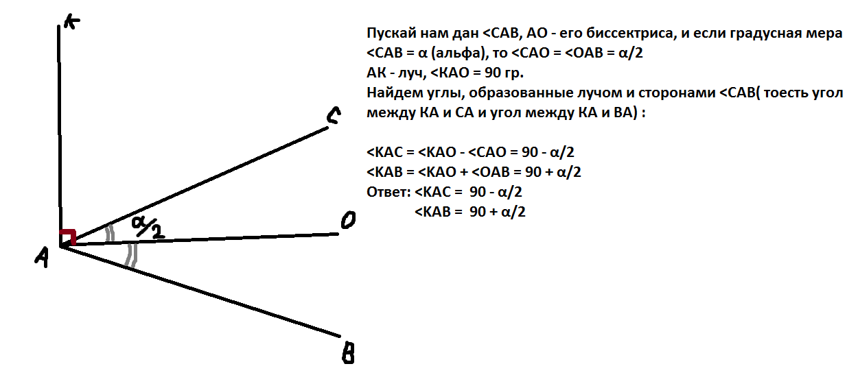Из вершины угла равного α (альфа) проведен луч перпендикулярный биссектрисе угла. Какие углы образует этот луч со сторонами данного угла?