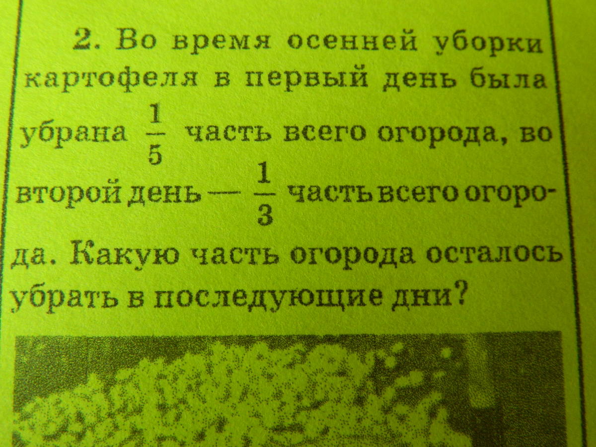 1 - (15 + 13) = 1 - (315 + 515) = 1 - 815 = 1515 - 815 = 715 (часть огорода осталось убрать в последующие дни)