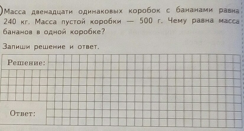 Масса двенадцати одинаковых коробок с бананами равна 240 кг. Масса пустой коробки - 500 г. Чему равна масса бананов в одной коробке?. Запиши решение и ответ.