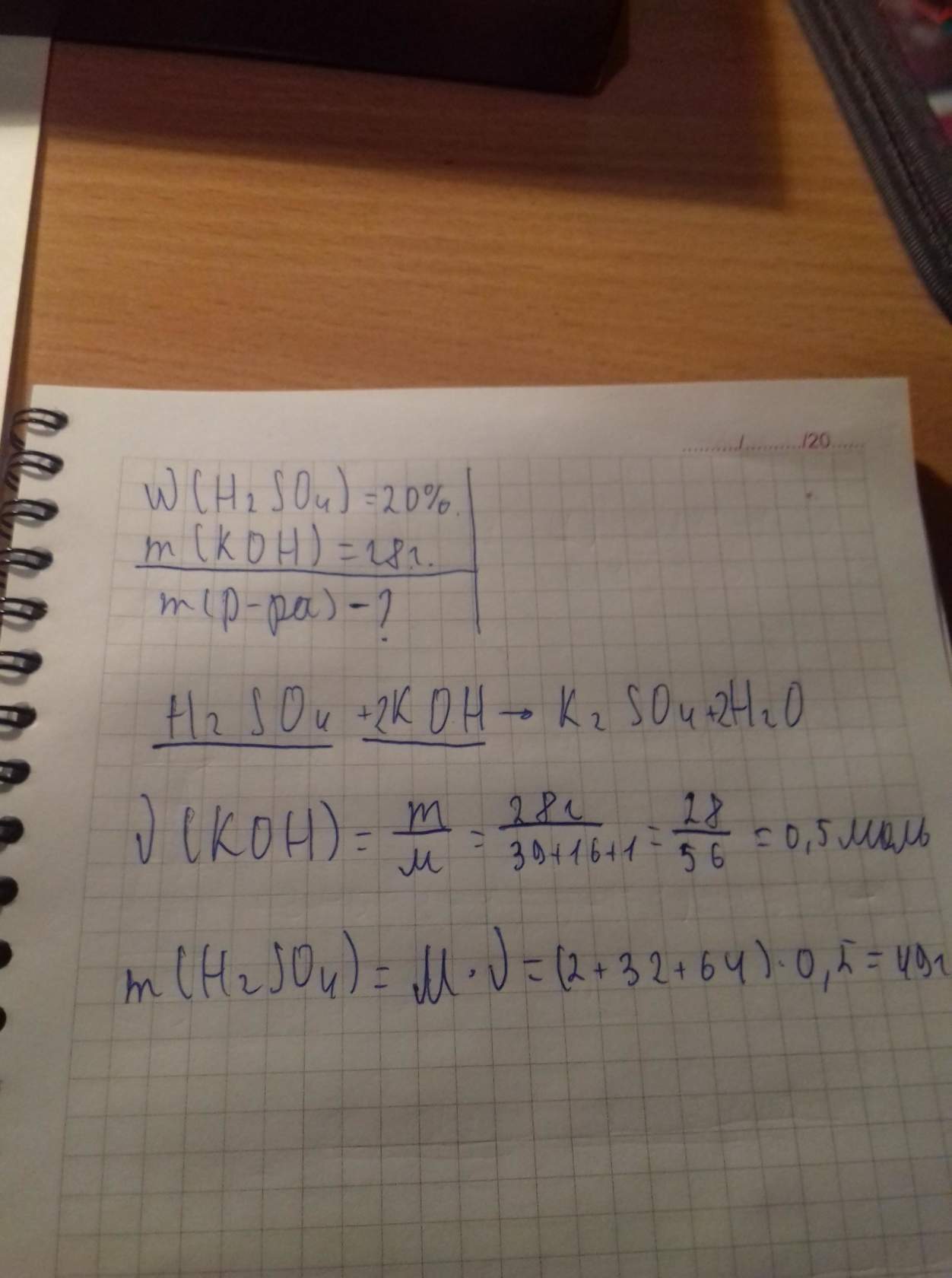 Найти массу раствора с массовой долей серной кислоты 20% для полной нейтрализации 28 г. гидрооксида калия.