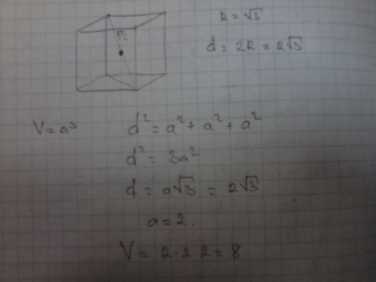 Получаем, что диагональ куба есть диаметр шара, значит диагональ куба равен 2sqrt(3) (sqrt - означает корень). Если сторона куба А, то A*sqrt(3)=2sqrt(3), значит сторона куба 2. Отсюда обьем равен 8
