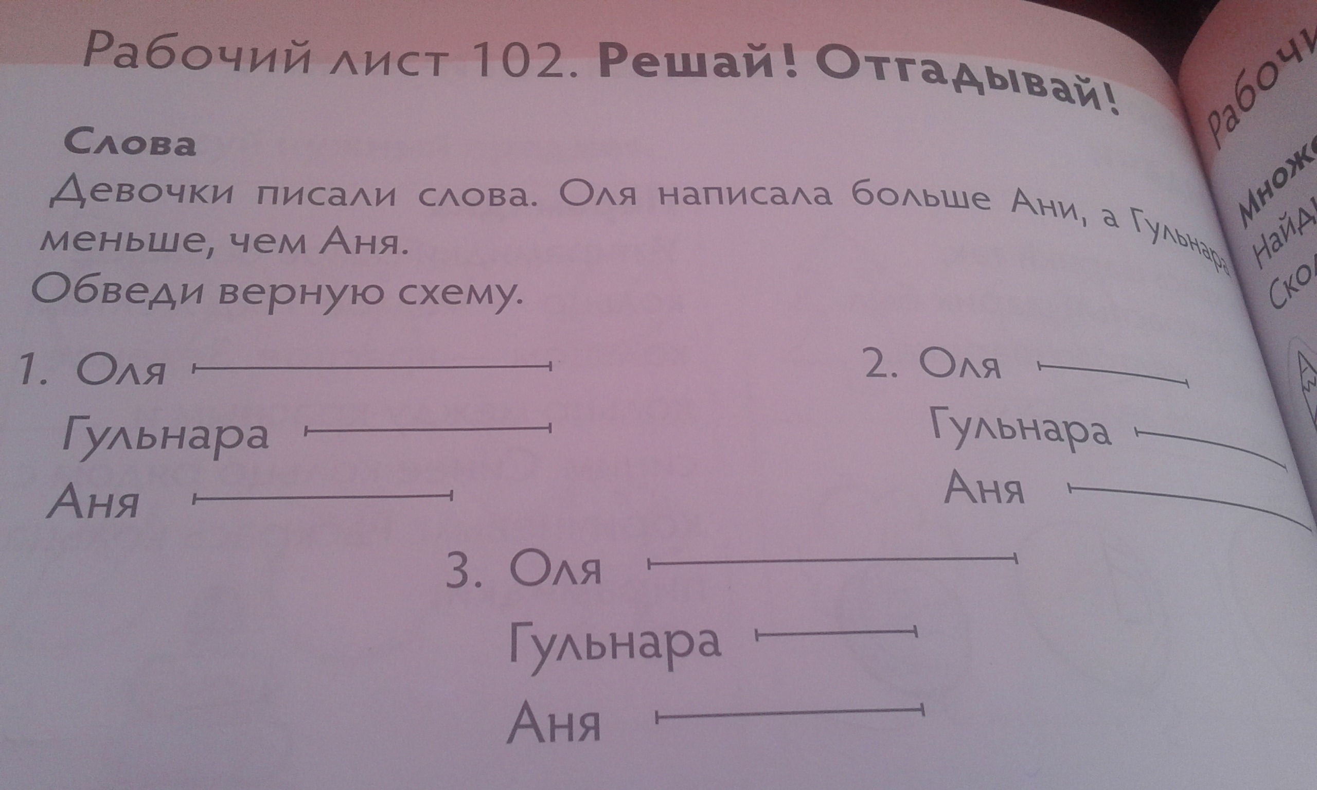Решай Отгадывай Слова Девочки писали слова. Оля написала больше Ани. а Гульнара менде чем Аня Обведи верную схему.