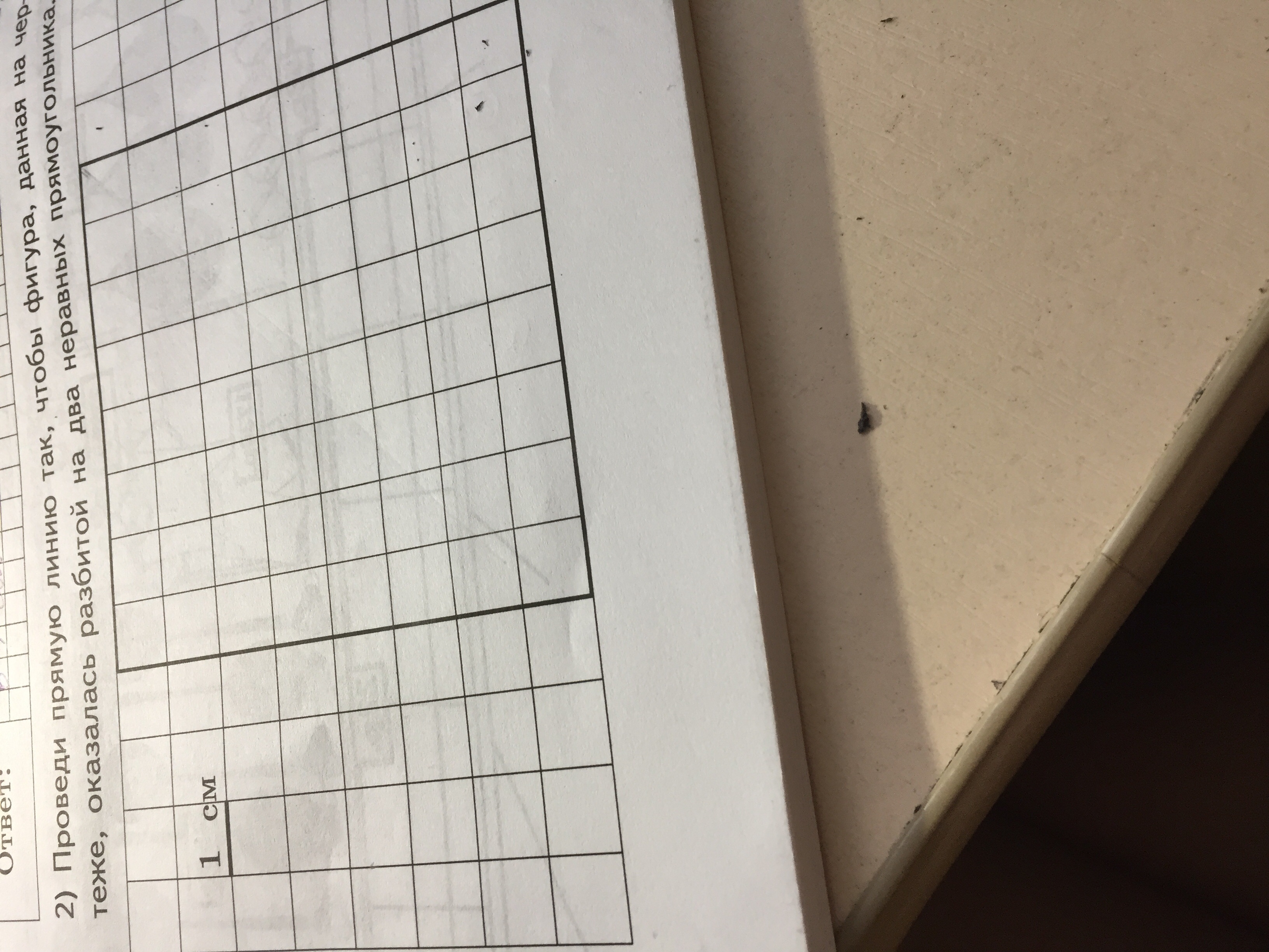 Проведи прямую линию так,чтобы фигура,данная на чертеже,оказалась разбитой на два неравных прямоугольника